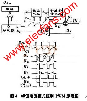 峰值電流模式控制簡稱電流模式控制。它的概念在60年代后期來源于具有原邊電流保護(hù)功能的單端自激式反激開關(guān)電源。在70年代后期才從學(xué)術(shù)上作深入地建模研究。直至80年代初期,第一批電流模式控制PWM集成電路(UC3842、UC3846)的出現(xiàn)使得電流模式控制迅速推廣應(yīng)用,主要用于單端及推挽電路。近年來,由于大占空比時(shí)所必需的同步不失真斜坡補(bǔ)償技術(shù)實(shí)現(xiàn)上的難度及抗噪聲性能差,電流模式控制面臨著改善性能后的電壓模式控制的挑戰(zhàn)。如圖4所示,誤差電壓信號(hào)Ue送至PWM比較器后,并不是象電壓模式那樣與振蕩電路產(chǎn)生的固定三角波狀電壓斜坡比較,而是與一個(gè)變化的其峰值代表輸出電感電流峰值的三角狀波形或梯形尖角狀合成波形信號(hào)UΣ比較,然后得到PWM脈沖關(guān)斷時(shí)刻。因此(峰值)電流模式控制不是用電壓誤差信號(hào)直接控制PWM脈沖寬度,而是直接控制峰值輸出側(cè)的電感電流大小,然后間接地控制PWM脈沖寬度。