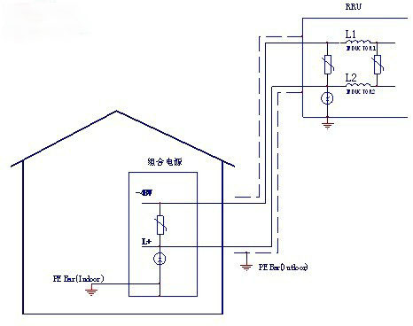 注:① 如果組合電源內部沒有配置合適的直流防雷器,則應該在RRU電源線引出機房處加裝一級直流防雷箱;