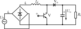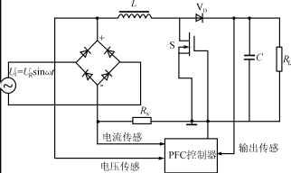 開關(guān)電源的功率因數(shù)校正器(PFC)可分為兩類,一類為有源PFC,由電感電容及電子元器件組成;另一類為無源PFC,一般采用電感補(bǔ)償方法使交流輸入的基波電流與電壓之間相位差減小來提高功率因數(shù)。在校正電路中有源PFC較多采用高頻升壓電路功率因數(shù)開關(guān)調(diào)節(jié)器,通常采用Boost電路,基本電路拓樸見圖1。
