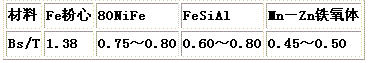 目前扼流圈鐵心使用的材料主要有兩類,一類是功率鐵氧體磁心加開氣隙,另一類是磁粉心。表1是它們的飽和磁感應(yīng)強(qiáng)度(Bs)的比較,其中錳鋅軟磁鐵氧體Bs值最低,為0.5T,約為鐵粉心的一半左右,因此在同樣安匝數(shù)下和鐵粉心相比截面將增加1倍左右,因而體積勢(shì)必增大。