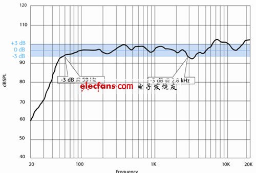 如果說+/-3dB所表示的是平坦特性,而不是頻率響應范圍,那么這個參數對頻率特性而言還有什么意義?回答這個問題前我們可以看一下制造商在典型揚聲器說明書上所標注的“+/-3dB頻響。”