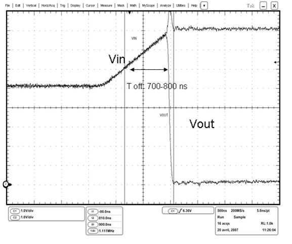 OVP器件的關閉時間從突破OVLO閥值開始算到Vout引腳下降為止。NCP360盡管消耗電流極低,但具有極快的關閉時間。典型值700ns/最大值1.5μs的關閉時間使得該器件成為當今市場上一流的器件,如圖5所示。