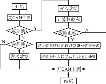 SJA1000在上電硬件復位之后,必須對其進行軟件初始化之后才可以進行數據通訊,初始化過程主要包括對其復位模式下配置時鐘分頻寄存器CDR、總線定時寄存器BTR0和BTR1、驗收代碼寄存器ACR、驗收屏蔽寄存器AMR及輸出控制寄存器OCR等,實現對總線的速率、驗收屏蔽碼、輸出引腳驅動方式、總線模式及時鐘分頻進行定義。具體的流程如圖5所示。下面為SJA1000發送和接收數據的流程,基本過程為主控制器將數據保存到SJA1000發送緩沖器,然后對命令寄存器的發送請求TR標志位進行置位開始發送;接收過程為SJA1000將從總線上接收到的數據存入接收緩沖器,通過其中斷標志位通知主控制器來處理接收到的信息,接收完畢之后清空緩沖器,等待下次接收,具體的流程如圖6和圖7所示。