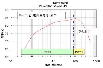 DC-DC轉(zhuǎn)換器的電源轉(zhuǎn)換效率和功率電感性能之間的關聯(lián)如圖3所示。PFM是指手機在待機狀態(tài)下保持低電流負荷的模式,這時電源轉(zhuǎn)換效率性能是與功率電感的Rac(交流電阻)以及電流-感值偏執(zhí)特性相關。圖4當中顯示了各功率電感的Rac特性以及圖5中開關頻率數(shù)是4MHz的DC-DC轉(zhuǎn)換器IC的電源轉(zhuǎn)換效率特性。