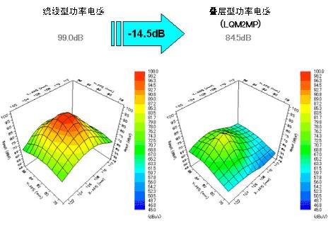 圖6顯示了繞線型功率電感和疊層型功率電感的磁束泄漏監(jiān)測數(shù)據(jù)。與一直以來作為DC-DC轉(zhuǎn)換器上使用的主要功率電感的繞線型功率電感相比,疊層型功率電感的磁束泄漏更少,現(xiàn)已證實閉合磁路的構造使磁束泄漏較少。這些數(shù)據(jù)表明在小型高速開關DC-DC轉(zhuǎn)換器電路中使用小型疊層型功率電感的情況下,能夠發(fā)揮它抗噪特性的特長。
