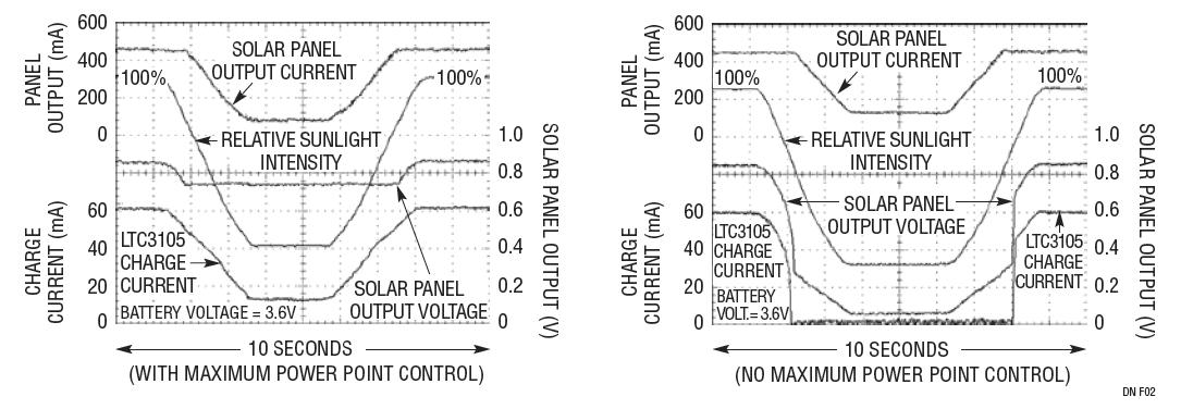 圖 2 示出了在采用和未采用最大功率點控制的情況下,陽光的變化對于充電電流的影響。模擬陽光的強(qiáng)度從 100% 降至約 20%,而后回升至 100%。請注意,當(dāng)陽光強(qiáng)度下降至 20% 左右時,太陽能板的輸出電壓和電流也下降,但是 LTC®3105 的最大功率點控制則可以防止太陽能板的輸出電壓降至 750mV 的設(shè)定值以下。它通過減小 LTC3105 的輸出充電電流以防止太陽能板電壓驟降至接近 0V 來實現(xiàn)上述功能,如圖 2 中右側(cè)的曲線圖所示。而在未采用功率點控制時,陽光強(qiáng)度的小幅下降也會完全阻斷充電電流的流動。