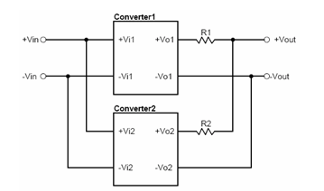 在兩組電源模塊的輸出端,分別串接Drop電阻,再并聯使用,如圖3-1所示。此種方式主要利用輸出電流對R1及R2形成的線性電壓降,使得兩組電源模塊會盡量達到平衡供應負載的目的,避免輸出電壓較高的電源模塊來提供大部份的負載需求。