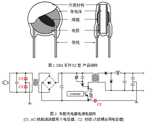 產(chǎn)品線如表2所示,產(chǎn)品結(jié)構(gòu)如圖1所示。產(chǎn)品的容值從100pF到4700pF,另外,額定電壓為AC300V (r.m.s.) 、耐電壓為AC2600V (r.m.s.) /60sec。滿足IEC 60384-14所規(guī)定的實(shí)驗(yàn)條件,通過(guò)新樹脂材料的絕緣涂裝,提高了耐溫度循環(huán)特性,能夠成為PHEV以及EV的車載充電器的AC線路濾波器用Y電容器、初級(jí)次級(jí)耦合用電容器,如圖2所示。