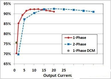 采用這種方案,轉(zhuǎn)換器效率比連續(xù)電流模式(CCM)高5%。此外,輕負(fù)載時(shí)關(guān)斷一相可以進(jìn)一步提高整個(gè)應(yīng)用負(fù)載范圍的效率。