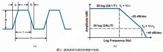 對于CCM中運作的降壓轉(zhuǎn)換器,電感電流一直是非零的正電流。在這種情況下,負載周期為D=Vout/Vin,在本例中為38%(5V/14V)。使用200kHz的開關(guān)頻率時,我們很快計算出導(dǎo)通時間為1.8μs。為支持此頻率,控制開關(guān)的上升/下降時間必須小于90納秒。這使得我們注意到第一個減少噪聲的方法,也就是斜率控制。您可能還無法理解,但是此時我們非常了解與PWM切換節(jié)點有關(guān)的諧波,也就是開關(guān)穩(wěn)壓器的控制波形。如果將此波形以圖1(a)中所示的梯形表示,波形的諧波便能夠以圖1(b)中的內(nèi)容表示,這表明了EMI背后的驅(qū)動因素。這一傅里葉包絡(luò)定義了可通過傅里葉分析或計算梯形波形導(dǎo)通時間及上升時間取得的諧波振幅。