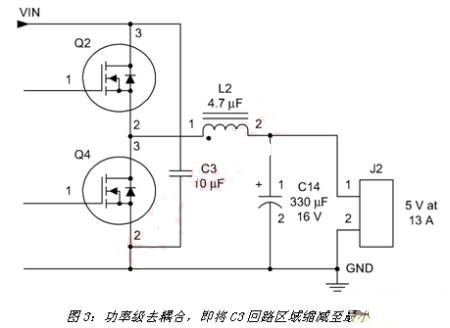 在一個電源的正確配置中,必須將大電流導(dǎo)體的回路部分縮減至最小。這樣做能夠?qū)⒆鳛樘炀€源和發(fā)射能量的電感降至最低。其中一個層面是有效放置元件及選用去耦電容。圖3顯示同步降壓轉(zhuǎn)換器的輸出功率級與濾波器。C3將功率級去耦合,以便在Q2啟動時提供低阻抗源。為了將輻射發(fā)射量降至最低,必須如圖所示連接C3,其中電容的固有阻抗、電路信號線及通過電感的互連均縮減至最小。另外,也需要具有諸如X7R等高自振頻率的高品質(zhì)電容電介質(zhì)。