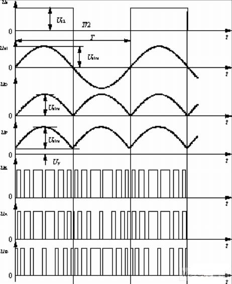 實現SPWM的控制電路框圖如圖3(a)所示,實際電路各點的波形如圖3(b)所示。