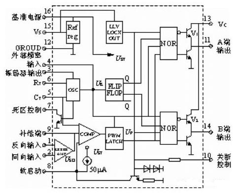 系統采用SG3525來實現SPWM控制信號的輸出,該芯片其引腳及內部框圖如圖2所示。