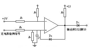 如圖1所示,過流保護信號取自CT2,經分壓、濾波后加至電壓比較器的同相輸入端,如圖4所示。當同相輸入端過電流檢測信號比反相輸入端參考電平高時,比較器輸出高電平,使D2從原來的反向偏置狀態轉變為正向導通,并把同相端電位提升為高電平,使電壓比較器一直穩定輸出高電平。同時,該過電流信號還送到SG3525的腳10。當SG3525的腳10為高電平時,其腳11及腳14上輸出的脈寬調制脈沖就會立即消失而成為零。