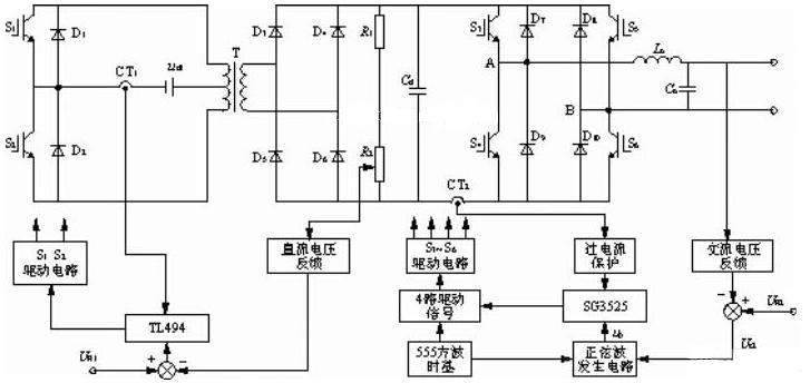 再經過全橋DC/AC逆變電路,得到220V/50Hz交流電壓輸出。為保證系統可靠運行,防止主電路對控制電路的干擾,采用主、控電路完全隔離的方法,即驅動信號用光耦隔離,反饋信號用變壓器隔離,輔助電源用變壓器隔離等。