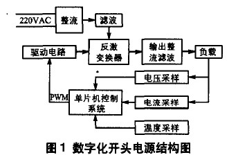 筆者設計的數字化開關電源額定功率12OW。系統以開關電源作為基本電路,采用高性能單片機作為控制系統,在控制算法的支持下,通過對輸出電壓和電流進行實時采樣,并與軟件給定值相比較,控制和調整開關電源的工作狀態,得到期望值。主要包括輸入的整流濾波校正、功率變換、輔助電源部分、驅動電路、單片機控制系統5部分。功率變換部分采用單端反激變換電路,輔助電源為驅動電路提供電能,驅動電路將來自單片機的PWM 信號放大后驅動主功率晶體管,單片機系統是整個電路的控制核心,通過采樣值的變化實時控制輸出PWM 的占空比。整個設計力求做到了性能最優,成本最低。其結構如圖1所示。