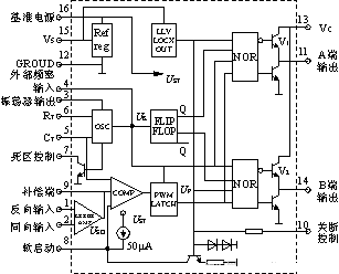 系統采用SG3525來實現SPWM控制信號的輸出,該芯片其引腳及內部框圖如圖2所示。