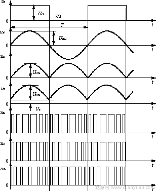 振蕩器腳5須外接電容CT,腳6須外接電阻RT。振蕩器頻率f由外接電阻RT和電容CT決定,f=1.18/RTCT。逆變橋開關頻率定為10kHz,取CT=0.22μF,RT=5kΩ。振蕩器的輸出分為兩路,一路以時鐘脈沖形式送至雙穩態觸發器及兩個或非門;另一路以鋸齒波形式送至比較器的同相輸入端,比較器的反向輸入端接誤差放大器的輸出。誤差放大器的輸出與鋸齒波電壓在比較器中進行比較,輸出一個隨誤差放大器輸出電壓高低而改變寬度的方波脈沖,再將此方波脈沖送到或非門的一個輸入端。或非門的另兩個輸入端分別為雙穩態觸發器和振蕩器鋸齒波。雙穩態觸發器的兩個輸出互補,交替輸出高低電平,將PWM脈沖送至三極管V1及V2的基極,鋸齒波的作用是加入死區時間,保證V1及V2不同時導通。最后,V1及V2分別輸出相位相差180°的PWM波。