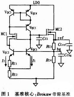 電子鎮流器的供電方式為半橋輸出接穩壓管給芯片供電,其輸出電壓為高壓正弦波(50~100 kHz),加之芯片內數字部分的干擾,這就給芯片的電源帶來較大的干擾。因此對芯片內基準的中頻PSR(Power Supply Rejection,電源抑制)有較大要求。本文從此角度在Brokaw帶隙基準的基礎上進行改進,采用LDO與基準的級聯設計來增加其PSR。