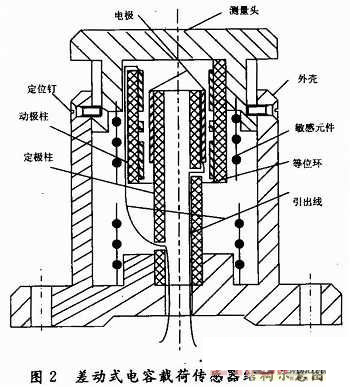 差動式電容載荷傳感器結(jié)構(gòu)示意圖如圖2所示。它主要由測量頭、外殼、敏感元件(彈性體)、定極柱、動極柱、電極、等位環(huán)、引出線等構(gòu)成。其特點為:測量范圍寬;靈敏度高,便于拾取信號;極板間不接觸、不變形、不磨損,機械損失小、壽命長;電容傳感器受溫度影響?。粍討B(tài)性能好;結(jié)構(gòu)簡單、適應(yīng)各種惡劣環(huán)境和場合。