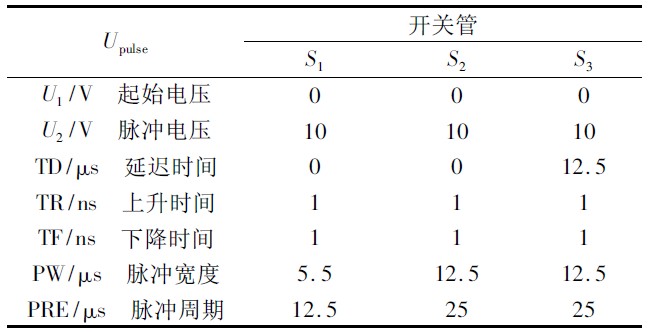 此仿真開關管的驅動信號采用脈沖信號激勵源VPULSE,其主要有7 個參數設置。