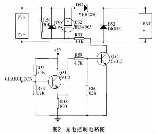 單片機(P2.0)給出充電的控制信號,即P2.0=1,NPN 型S9013 的三極管導通,由于此三極管工作于射極輸出狀態, 其發射極為高電平,Q54 (2SD667)NPN 三極管導通, 由于穩壓管D50的作用, 使得IRF4905管的柵源電壓鉗位在-10V,IRF4905 管導通, 太陽電池向蓄電池充電。反之,前兩極三極管均截止VGS=0V,IRF4905 管斷開,太陽電池不能向蓄電池充電。