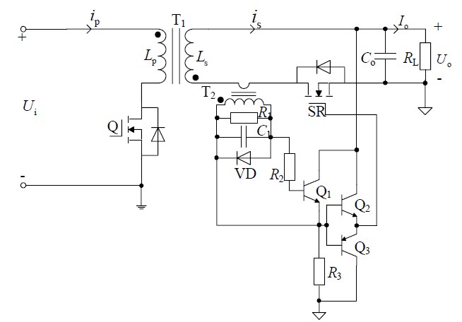 SR 的驅動是同步整流電路的一個重要問題,需要合理選擇。本文采用分立元件構成驅動電路,該驅動電路結構較簡單、成本較低,適合寬輸入電壓范圍的變換器,具體驅動電路如圖2 所示。SR 的柵極驅動電壓取自變換器輸出電壓,因此使用該驅動電路的同步整流變換器的輸出電壓需滿足SR 柵極驅動電壓要求。