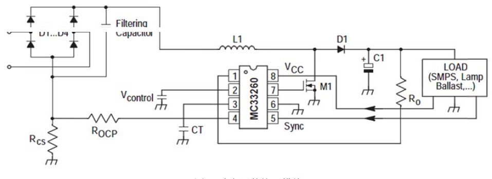 選用小功率功率因數(shù)校正芯片MC33260,它工作在電流臨界模式。MC33260應(yīng)用簡(jiǎn)單可靠。通過(guò)電流檢測(cè)和電壓反饋,通過(guò)PI調(diào)節(jié)來(lái)保持電壓恒定。通過(guò)對(duì)開(kāi)關(guān)管的PWM控制來(lái)得到所需要電壓。可實(shí)現(xiàn)0.998的功率因數(shù)校正和輸出穩(wěn)定直流電壓的功能。