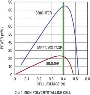 為了從光伏電池抽取最大功率,電源轉(zhuǎn)換器的輸入阻抗必須與電池的輸出阻抗匹配,從而使系統(tǒng)能在最大功率點(diǎn)上工作。圖3顯示了一個(gè)典型的單節(jié)光伏電池的功率曲線。為了確保抽取最大功率,光伏電池的輸出電壓應(yīng)該與功率曲線的峰值點(diǎn)相對應(yīng)。LTC3105 調(diào)節(jié)提供給負(fù)載的輸出電流,以保持光伏電池的電壓等于最大功率點(diǎn)控制引腳設(shè)定的電壓。因此可用單個(gè)電阻器設(shè)定最大功率點(diǎn),并確保從光伏電池抽取最大功率和峰值輸出充電電流。