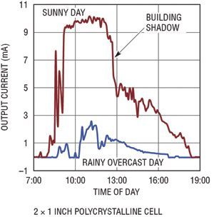 用光伏電池可產(chǎn)生多少功率取決于多種因素。電池的輸出功率與投射到電池上的光強(qiáng)度、電池的總面積以及電池的效率成正比。大多數(shù)光伏電池都規(guī)定在完全直射的太陽光 (1000W/m2) 下使用,但是在大多數(shù)應(yīng)用中,不可能有這么理想的條件。就依靠太陽光工作的設(shè)備來說,可從電池獲得的峰值功率可能非常容易變化,由于天氣、季節(jié)、煙霧、灰塵和太陽光入射角的變化,今天與明天相比有可能相差10倍。在充足的太陽光照下,晶體電池視電池特性的不同而有所不同,典型輸出功率約為每平方英寸40mW。面積為幾平方英寸的光伏電池足夠給多個(gè)遠(yuǎn)程傳感器供電以及給電池涓流充電了。