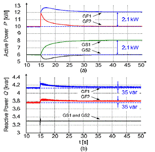 一段時間后,二次控制器控制逆變器動作,第一個電網(wǎng)上的階躍負(fù)載只由第一個電網(wǎng)上的逆變器補償。交換功率受到控制重新回到之前的設(shè)定值。不同逆變器的無功功率如圖7b所示。開始時,所有逆變器提供的無功功率都近似為14.6kvar。15s的時候,第一個電網(wǎng)的無功功率增加了70var。正如前面提到的,本次仿真并沒有對無功功率進行二次控制。電網(wǎng)形成方式的逆變器補償增加的階躍負(fù)載,電網(wǎng)支持方式的逆變器提供相同數(shù)量的無功功率。