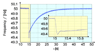 由于15s加入了階躍負(fù)載,頻率的降落由下垂控制功能決定。當(dāng)一次控制迅速穩(wěn)定頻率后,二次控制相對緩慢的將頻率調(diào)回50Hz。