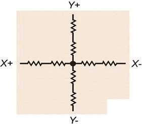 在最簡單的四線(Four-wire)電阻式連接中,頂層兩端和低層兩端分別各連接兩個電極,兩層的電極互相呈九十度交叉,形成四線星狀連接結(jié)構(gòu),這實際上就是一對彼此正交的電位計(圖2),相當于機械操縱桿的平面屏幕模擬。為了在X軸方向測量觸摸位置,觸控板的控制器將X-設(shè)為接地,而X+偏置為參考電壓,然后從Y層的兩端讀取電壓,以找出X軸上兩層的接觸點。同樣地,控制器透過在Y層的電極上加載驅(qū)動電壓,并從X層讀取觸摸點電壓,可以確定Y軸上的觸摸位置。