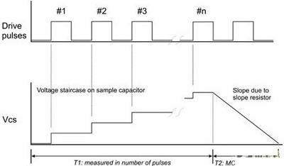 脈沖串產(chǎn)生的第一個斜坡是加到采樣電容上的梯級波形訊號,脈沖串過后,驅(qū)動器把斜率電阻的參考端切換為高電平,對采樣電容進行放電,直到將電荷用完,電壓比較器檢測出零交叉點為止,獲得零交叉點所需的斜坡時間與X、Y電荷耦合成比例,并隨用戶手指觸摸面板表面而減小(圖5)。