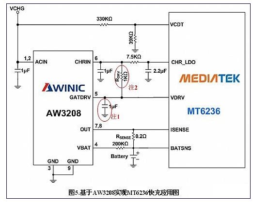 上海艾為電子專門針對MT6235/36平臺推出的AW3208在增加OVP功能的同時,提供了智能充電功能,以滿足快速充電的功能。如圖2所示,AW3208內置專有的K-ChargeTM技術,可根據芯片溫度智能調整輸出電流,以保證在充電期間整個充電系統的安全。使得手機在實現快速充電的時候不會因為由于環境溫度較高或者充電電流過大導致芯片進入過溫保護使得充電沒法正常進行。圖3為在MT6235上的典型應用圖。
