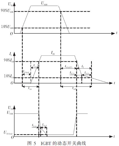 根據調制器的要求,由單片機輸出一定重復頻率的觸發(fā)脈沖經接口保護電路轉換后驅動IGBT的柵極。IGBT在柵極有驅動時接通,無驅動時關斷,實現了可控的開關功能。IGBT的動態(tài)開關曲線如圖5所示。