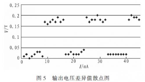 在軟硬件設計全部完成后的測試階段,發現DA輸出的電壓值在某些點上與理論值不符,具有較大差異并呈現一定的周期性(且都是輸出值比理論值小)。通過初步分析,認為是DA的控制字寫入在某些點上不正確,于是將硬件電路上AD的模擬電壓輸入引腳斷開并直接接在DA電壓輸出腳,并編寫了測試小程序,將0~5V每次遞增0.02V對應的控制字寫入DA,用AD測其輸出電壓值并將結果通過串口返回PC,然后將電壓理論值與實測值的差值全部導入Excel,然后在Excel中插入這些值的散點圖,散點圖如圖5所示,0~250mA電流值分別對應0~5V的電壓值(圖中截取了0~45mA這一段),縱坐標為輸出電壓理論值與實際值的差異值。