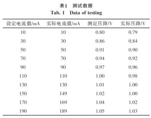被測二極管采用1N4118,用2個優利德數字萬用表UT33D作為測量儀器對系統進行測試,其中一個以毫安檔(量程200mA)與被測二極管串聯,另一個以直流電壓檔(量程5V)與被測二極管并聯,在不同的設定電流值下測量二極管的實際電流和電壓,測試結果如表1。