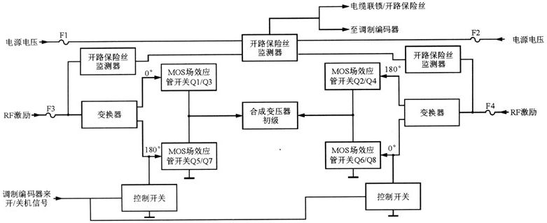 在射頻功放模塊的設計中,兩個半橋式組態采用單獨的電源和射頻激勵輸入,這樣可以使每個放大器兩個半橋獨立地進行工作。如將Q1/Q3源極和QS/Q7的漏極接在一起,射頻輸出從0V到+V,則可保證當一個全橋組態的射頻功放模塊在任何一個半橋出現故障時,射頻功放模塊仍然可以工作。只是射頻輸出電壓減小為全橋組態的一半而已。