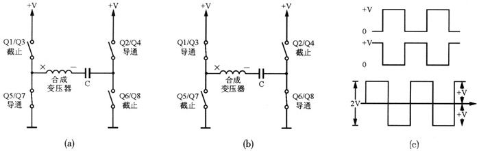 在射頻周期的負半周,Ql/Q3和Q6/Q8處于截止狀態,相當于開關斷開;Q2/Q4和QS/Q7則是飽和導通的,相當于開關接通。Q2/Q4和QS/Q7串聯導通電源電壓為+V,若忽略MOS管的飽和壓降,+V將全部降落在合成變壓器上。在射頻周期的正半周,Q1/Q3和Q6/Q8處于導通狀態,Q2/Q4和QS/Q7為截止狀態。Ql/Q3和Q6/Q8串聯導通電源電壓+V,+V全部降落在合成變壓器上。由圖4可見,合成變壓器初級電壓方波輸出相差180°,說明輸出電壓的峰峰值為+2V。MOS開關的作用就是有效地將整個電源電壓跨接在合成變壓器的初級繞組上,在射頻激勵信號的每半個周期是反相的。作為全橋組態,輸出就是兩倍電源電壓的射頻輸出。為了防止直流電壓通過變壓器的繞組通地,應在每部分的射頻輸出都串聯有隔直電容C。