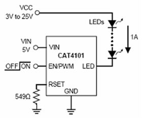 而在要求驅(qū)動(dòng)大電流的高亮度LED汽車照明應(yīng)用中,可以采用安森美半導(dǎo)體的CAT4101高亮度線性LED驅(qū)動(dòng)器。CAT4101能驅(qū)動(dòng)一串電流高達(dá)1 A的高亮度LED,且滿載時(shí)的壓降僅為極低的0.5 V。這種簡(jiǎn)單方案不要求電感,消除開關(guān)噪聲,將元件數(shù)量減至最少,并簡(jiǎn)化設(shè)計(jì),典型應(yīng)用電路如圖5所示。