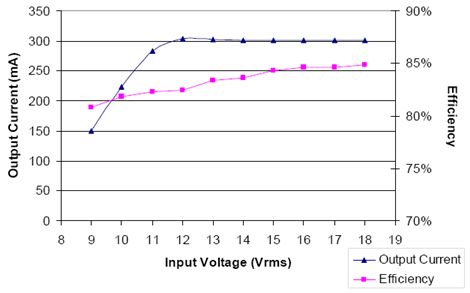 計算得出,對于300 mA輸出,IRSET = 0.12 mA。RSET電阻值應該是10kΩ。較小的RSET電阻可能會增加輸出電流,為了穩定運行建議使用至少8.0 kΩ的電阻。如果輸入電壓足夠高(如15 Vac),可以設置RSET為8.2 kΩ,因此可保證至少350 mA的輸出電流。CTRL經R2從LED的陰極獲得電壓。R2的值并不重要。