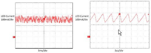 在根據圖1的電路圖配置的電路中,Vin=12 Vac 50Hz。由于AC線路輸入,LED電流出現了很輕微的低頻(AC頻率的兩倍,2 × 50HZ)波動。使用較大容量的C1或較高的Vin將進一步平穩與AC相關的紋波電流。
