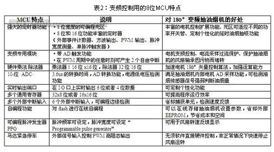 此外,這些MCU還具有帶2個(gè)自由中斷專用變頻控制模塊,以在PWM周期的任意時(shí)刻產(chǎn)生中斷,根據(jù)用戶需要的任意時(shí)刻對電流進(jìn)行采樣;專用于控制 PWM高阻態(tài)輸出的獨(dú)立外部信號(hào)輸入,可在非正常情況下快速停止風(fēng)扇的轉(zhuǎn)動(dòng);以及8位的可編程死區(qū)控制(死區(qū)時(shí)間范圍:0.1 s~25.6 s)等。圖2顯示了8位變頻控制MCU的主要特點(diǎn),表2則這些功能給出了詳細(xì)說明。