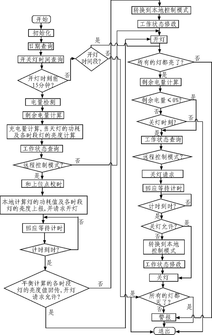 進行太陽能路燈電池板電流檢測,蓄電池電壓檢測,蓄電池電量監測,以及環境溫度的檢測,采用光開時關,并實時上傳工作環境及狀態數據,預警故障,保證系統的可靠性。圖2為太陽能路燈的開、關控制流程網。