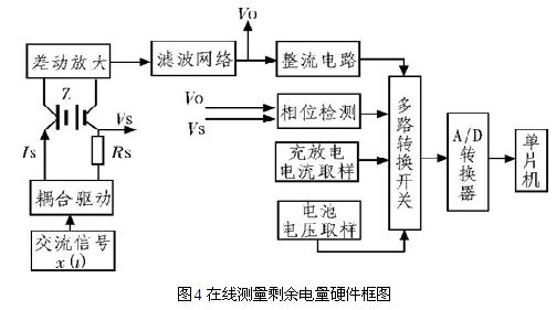 給電池施加一個固定頻率和固定電流(日前一般使用l kHz頻率、50 mA小電沆),然后對其電壓進行采樣,經過整流、濾波等一系列處理后通過運放電路計算出該電池的內阻值。圖4為在線測量剩余電量硬件框圖。