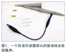 在測量電源軌的紋波時(shí),必須盡量減小噪聲,因?yàn)榧y波幅度可能很小。示波器探頭是基本的測量工具,但它們可能引入噪聲與誤差。地線(如與標(biāo)準(zhǔn)示波器探頭連接的那根線)可能增加一些不會出現(xiàn)在示波器軌跡上的電路噪聲。線路環(huán)就像一根天線,會提取周圍的雜散磁場。環(huán)路面積越大,提取的噪聲就越多。為證明這個(gè)理論,可將示波器地線連接到探頭尖端,然后到處移動。示波器會隨著地線的移動而顯示出噪聲的增減。用一個(gè)示波器探頭及其地線和插座可以做一個(gè)簡單的連接板(圖1)。
