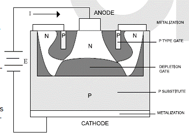 當一個反向偏壓加到PN結的陰極和陽極時,這個恒流二極管開始導通,當反向偏壓增加到VL時(見圖2),其電流由于N區(qū)的體電阻也跟著增加,當電流增加到曲線的拐點時,在N區(qū)和P型柵之間形成一個耗盡層。這個耗盡層減小了N區(qū)中電流的路徑也就減慢了電流的增加速度。結果這個耗盡層遇到了P型柵于是就產(chǎn)生了夾斷效應,這使得電流變成恒定而幾乎和所加電壓無關,直到所加電壓達到一個擊穿點Vb。如果所加電壓反過來,那么就相當于一個正向電壓加到一個PN結,其特性就和一個普通二極管加上正向電壓時一樣。