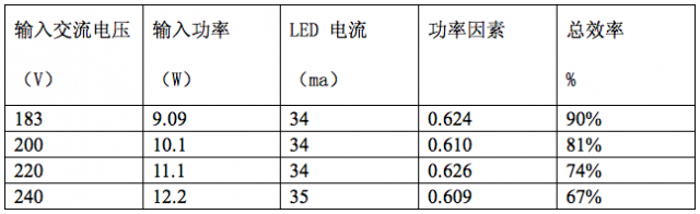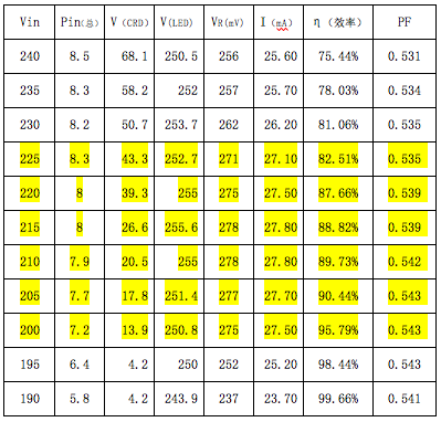 下面舉一個實測的結果為例,這是一個80顆3014串聯(lián)的球泡燈,采用了5顆Semitek 的S-562T并聯(lián)。它在不同的輸入市電電壓時,所測得的結果如下表所示。