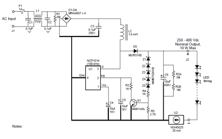 其實這個電源的核心就是一個恒流二極管NSI45025,以確保LED恒流在25mA。所以它只能用于小功率貼片式的LED。其中外加的集成電路NCP1014實際上是一個有源式的功率因數(shù)校正(PFC),可以把它的功率因數(shù)提高到>0.9以滿足美國能源之星的要求。輸入端的L1,C1,C2是一個防電磁干擾EMI的濾波器。它的缺點是非隔離,所以220V會直接加到負載LED上。但是歐盟IEC 61347-2-13 (5/2006)標準規(guī)定在LED負載端電壓不可超過25VAC或35VDC。所以采用非隔離電源是無法出口歐盟的。